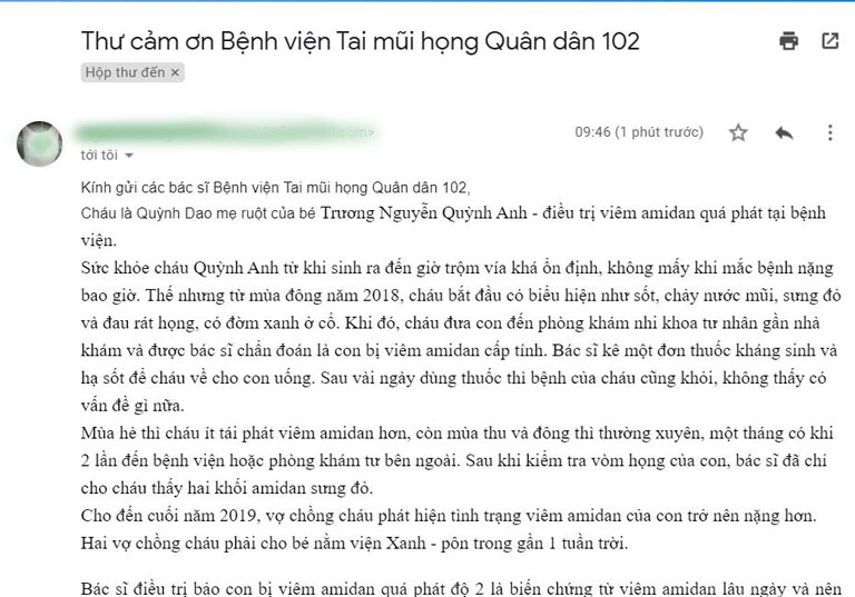 Như ngày hôm nay, khi tôi đang ngồi làm việc thì nhận được tin nhắn của chị Nguyễn Quỳnh Dao (29 tuổi) gửi mail đến hòm thư bệnh viện phản hồi về kết quả điều trị viêm amidan quá phát cho con gái chị – cháu Trương Nguyễn Quỳnh Anh (sinh năm 2014). Hiện tại, cả hai mẹ con đều đang sinh sống tại Hà Nội.